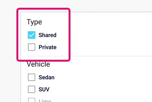 When you’re comparing airport transfer options available, click on the ‘private tab’ of the search results to see all the private airport transfer options available to you.